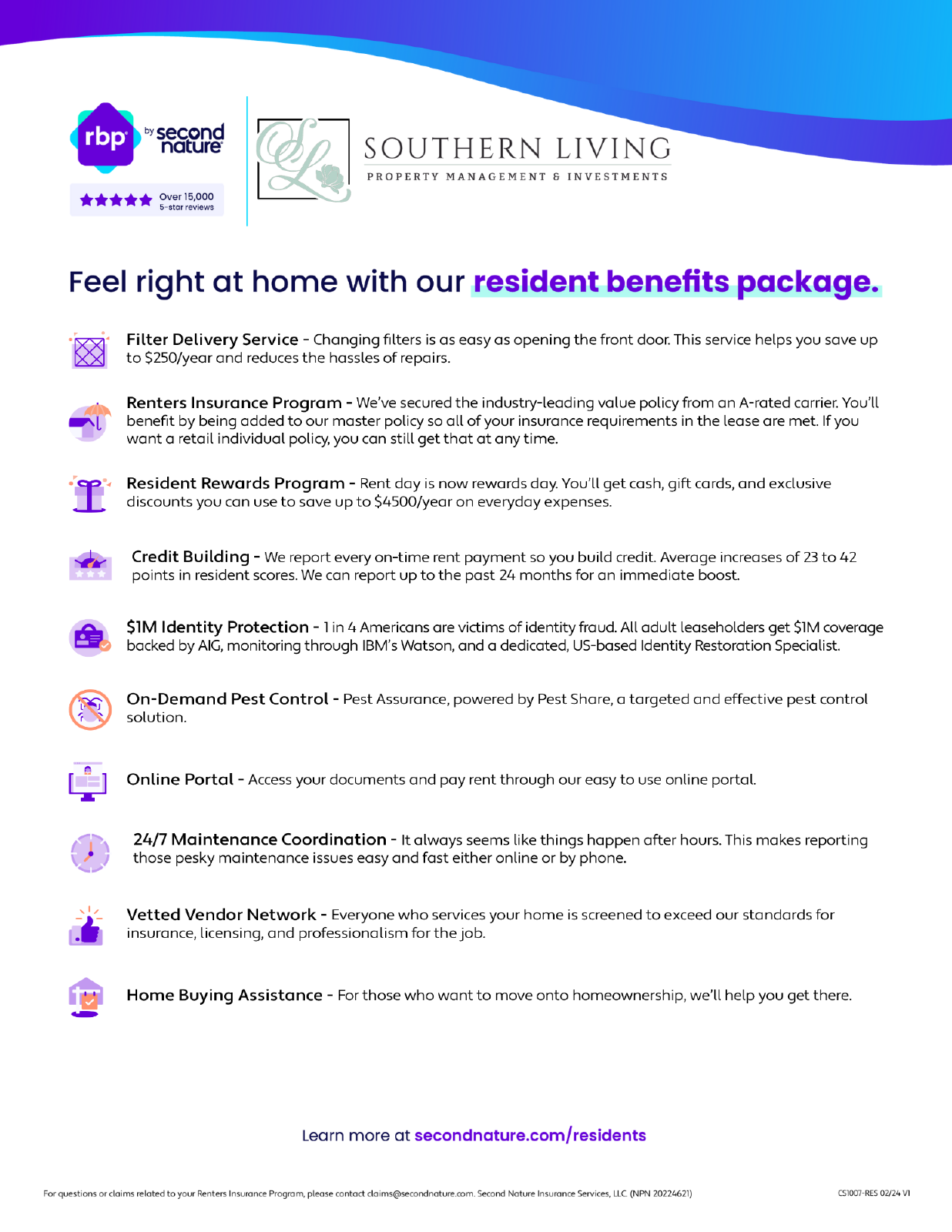 RESIDENT BENEFIT PACKAGE INCLUDES AIR FILTER DELIVERY PROGRAM/ RENTERS INSURANCE/POSTIVE CREDIT REPORTING & MORE $39.95 PER MO
